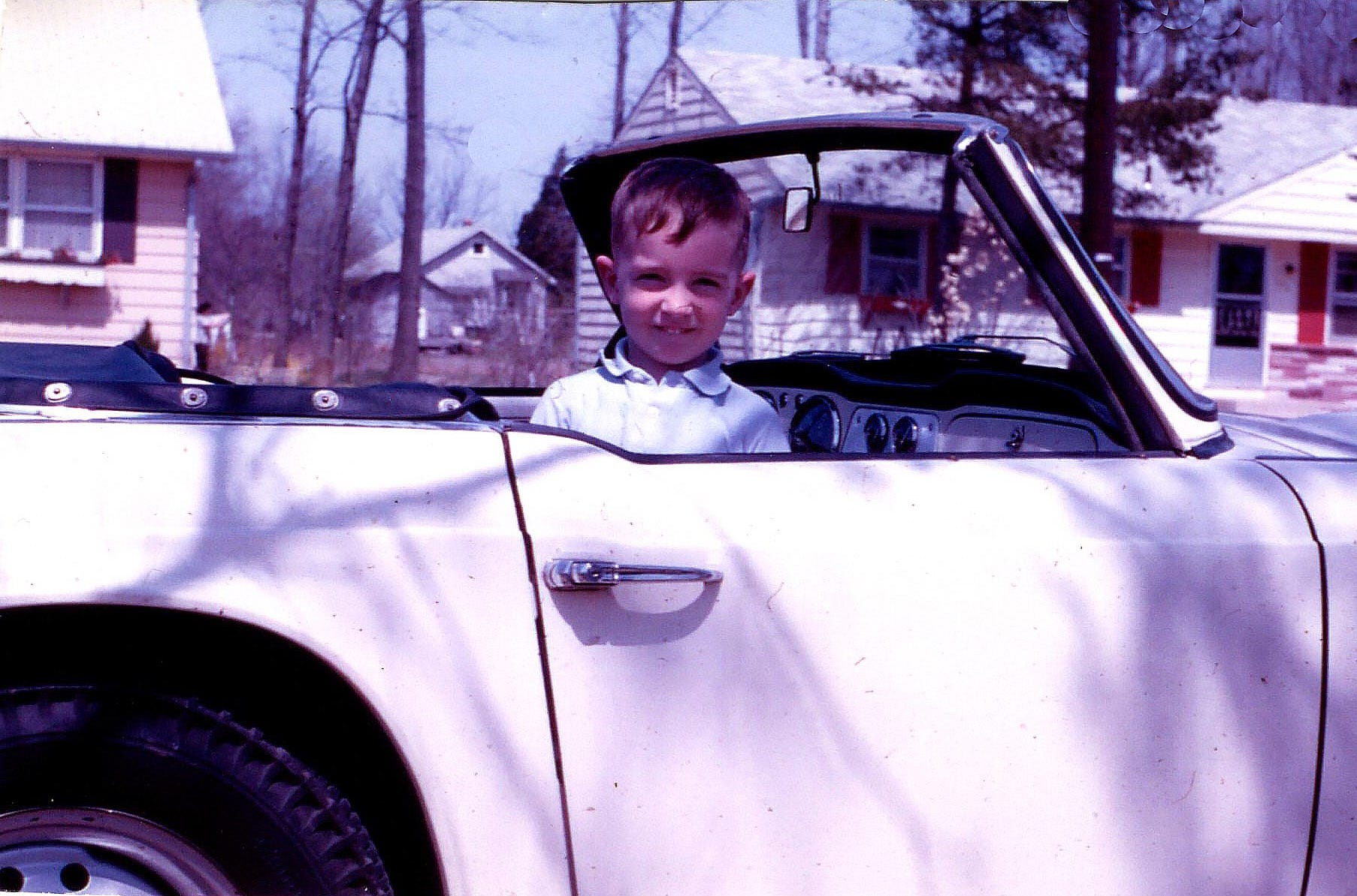 In my Dad’s TR4. He’d take me out driving on back roads at 100mph, seat-belted in. I have very vague memories of the rides.