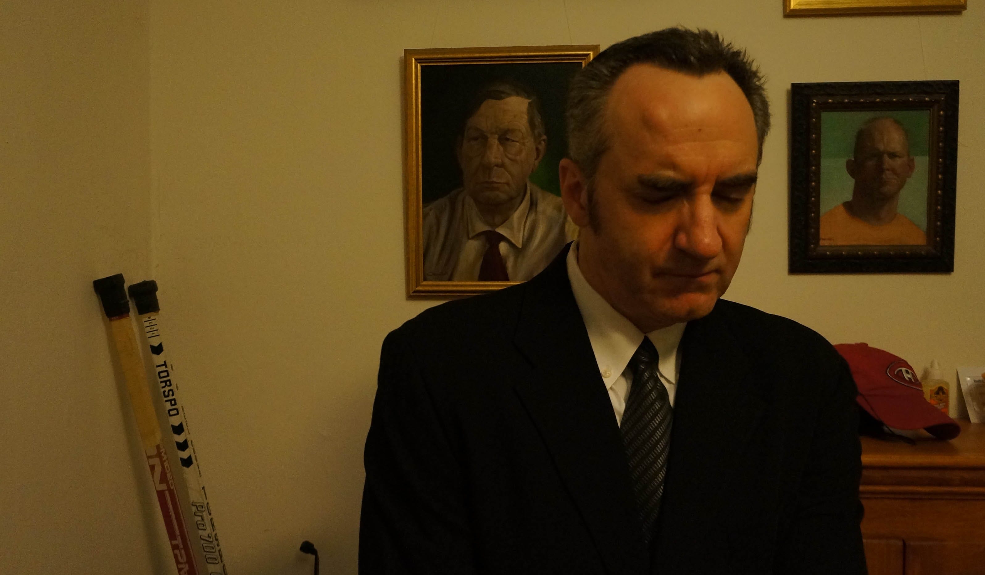 Me, plus a portrait of W. H. Auden and the artist (right) and my hockey sticks.