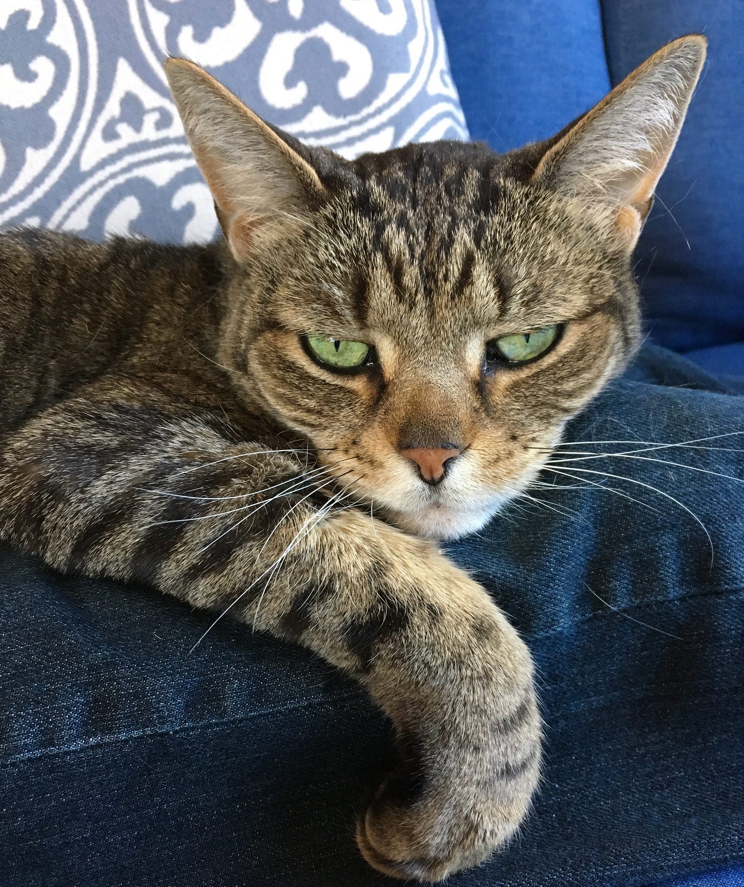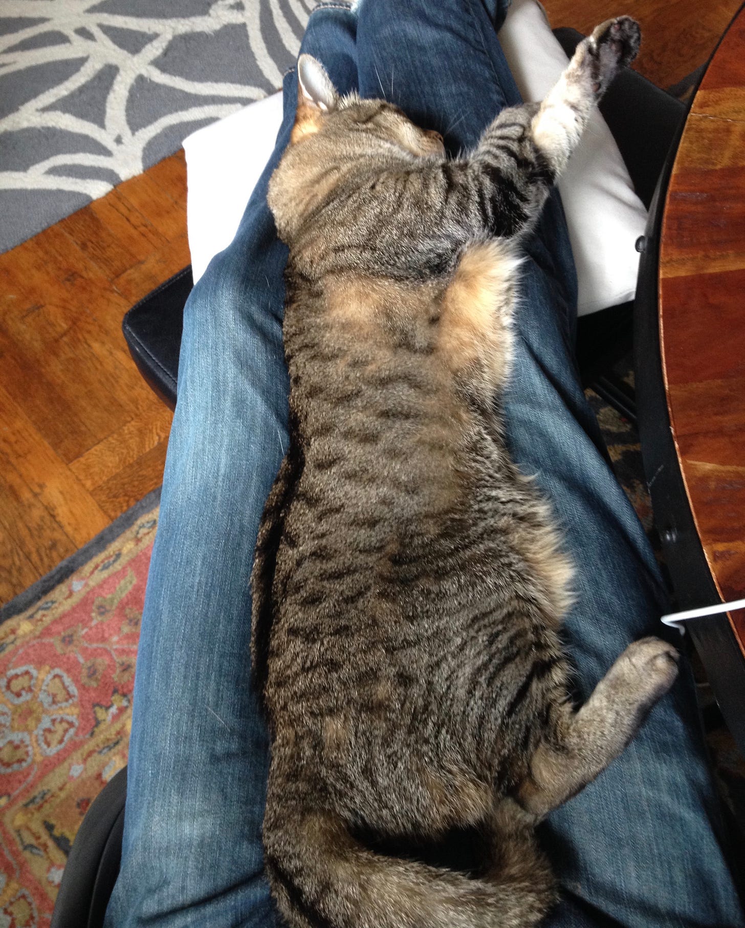 Our Cat T, now chasing bunnies and other critters in Cat Utopia, was looong. As you see, I have looong femur bones on my 6-1 frame. Fully stretched, T occupied my legs from ankles to stomach.