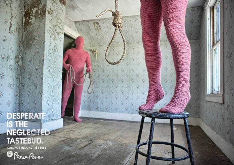 Ad for the Providence, Rhode Island location of Pizza Pie-er. Looks like a scene from American Horror Story. Taste Buds, I think, should be non-threatening sorts, not suicidal pink Lugo Men. Nice location/photo. Created by Keith Manning, creative/art director, based in Boston.